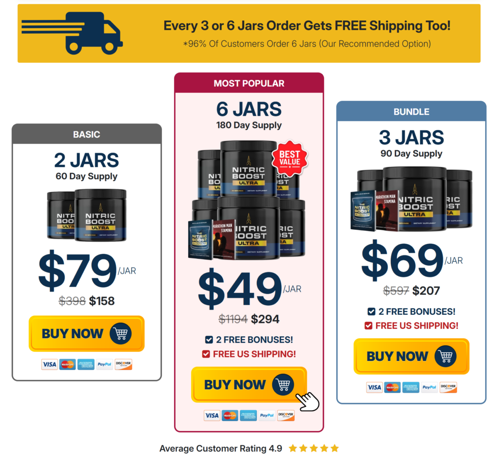 This Nitric Boost Review confirms that the best price is found only on the official store. For $49, you get the full strength supplement plus a 60-day money-back guarantee. Shipping is fast and free for all regional orders.